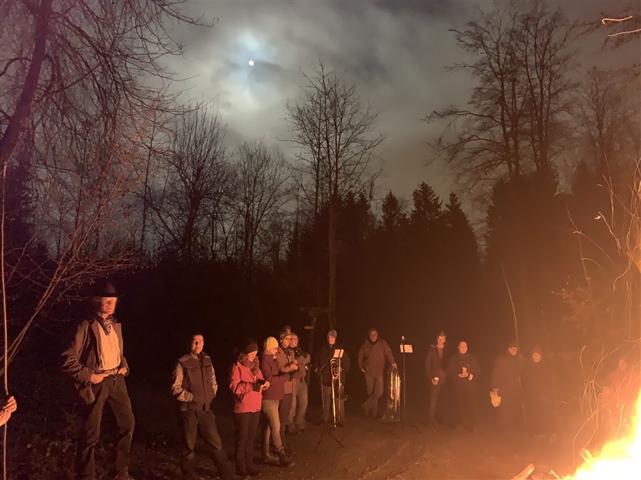 Rund 90 Personen besammelten sich, bei klirrender Kälte auf dem Hönggerberg um pünktlich 18.30 Uhr am Fackelzug zur Waldlichtung teilzunehmen. Dort wurden sie von der Bläsergruppe des Musikverein Eintracht Höngg empfangen. Ein grosses Feuer erhellte den Platz.